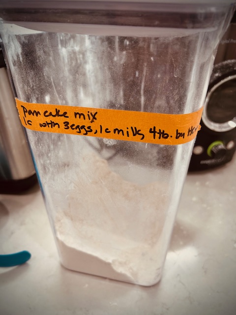 We keep a container of pancake mix at the ready for quick meals. Here is my go-to base recipe (I usually make about 10 batches to save in the cupboard):
