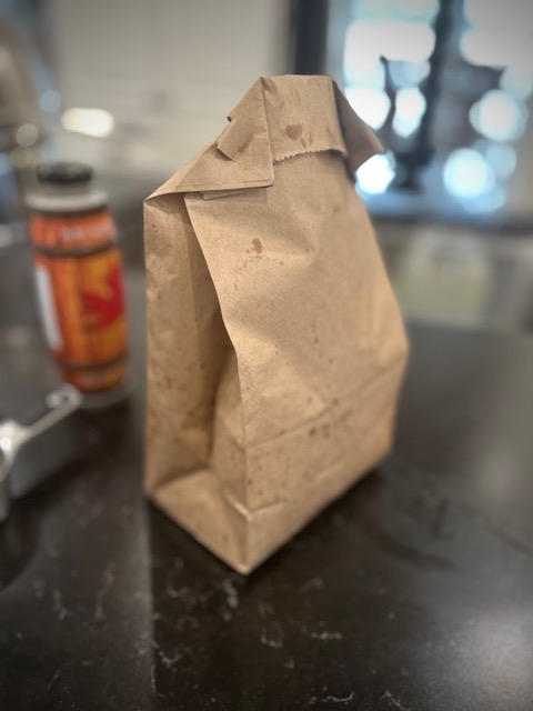 - Fold the top of the bag down ~1″ then fold the corners in and cut little tabs in the folded down corner sections. Fold the tabs down to hold the bag closed during popping