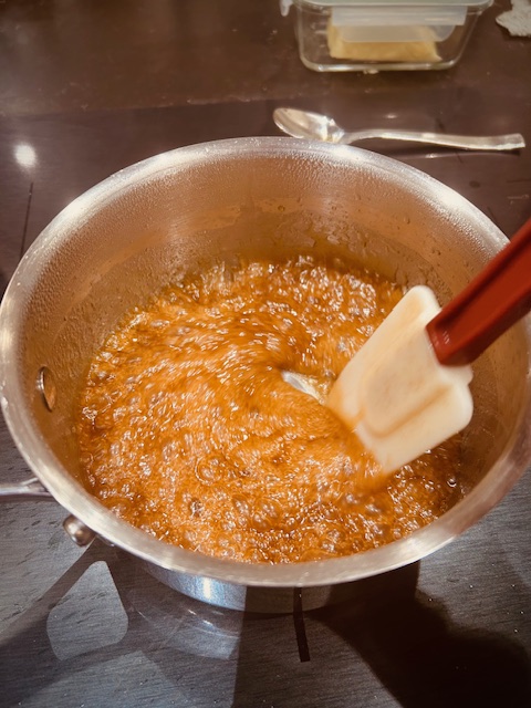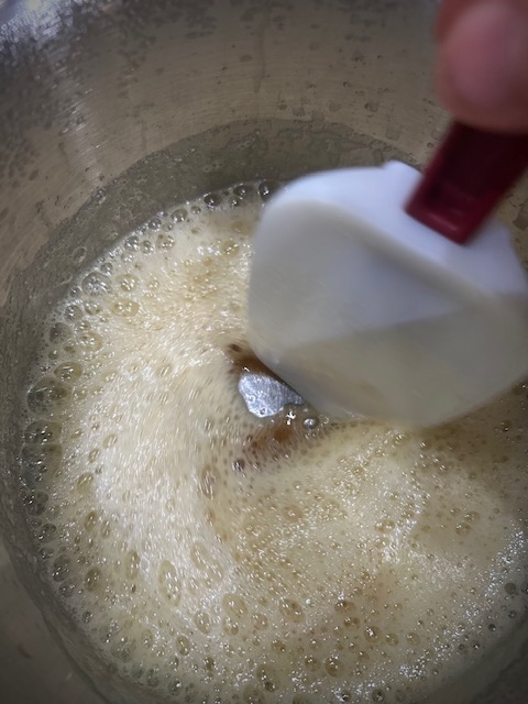 - Swirl the pan and stir to keep it from burning on the bottom. You will hear it hissing and sizzling and large bubbles will form as water cooks off. When the large bubbles have subsided, small foamy bubbles will form and the pan will sound almost silent. At this point, watch very carefully for a change in colour as the milk solids start to turn golden brown and smell nutty and delicious (~3min).