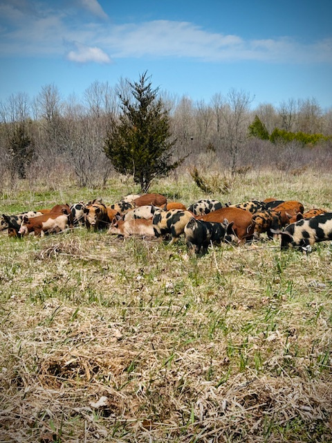 The pigs are now in their summer enclosure. This year, Greg left a nice wide walking path around the enclosure. We have been taking a “pig walk” every day through the fields and forest. It is so much fun to see the pigs running and playing. We envision a border garden and some picnic sites in little nooks around the pig walk. We will offer this as an activity during the store opening hours.