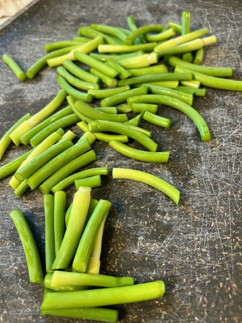 Cut the scapes into manageable pieces (~1″) and remove any dry or damaged parts (often the very top is dry and should be removed)