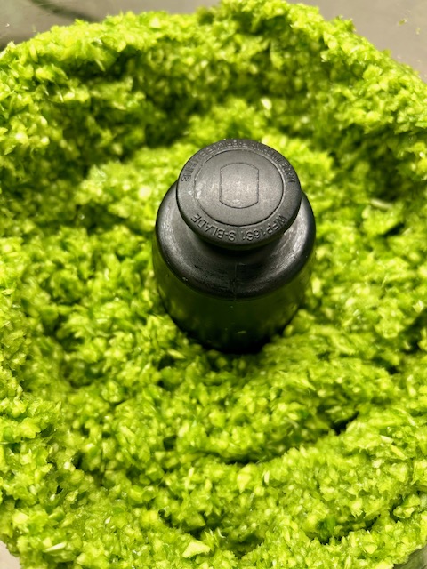 | Equipment: -Knife and Cutting Board -Food scale -Food processor -Quart sized jar Wide mouthed canning funnel (optional) -Tamper (to press down the paste; if you don’t have one, you can use a pestle, a tamper from your blender or any other clean and flat object that can pack everything down) -Zip lock bag or fermentation stone and lid -Baking sheet or pan (keep fermenting jar on/catch drips) |