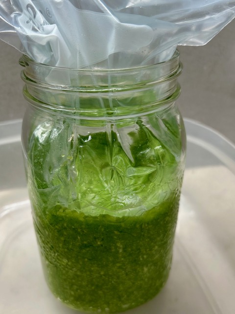 Next, you need to keep everything in place and under the brine. The easiest way to do this is to place an empty ziplock bag on top, smooth it over the surface with your hand from the inside of the bag, then fill it with water to the top of the jar, and zip it closed. Once closed, gently press again until you are sure you have the entire surface covered and you can see a thin layer of brine on top of your paste.