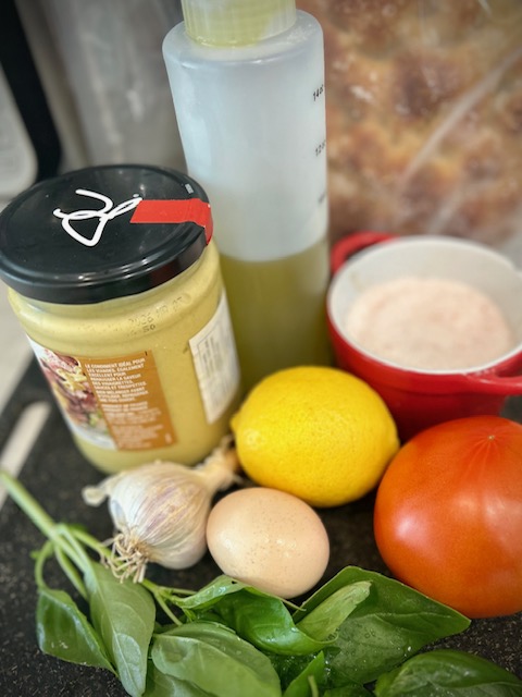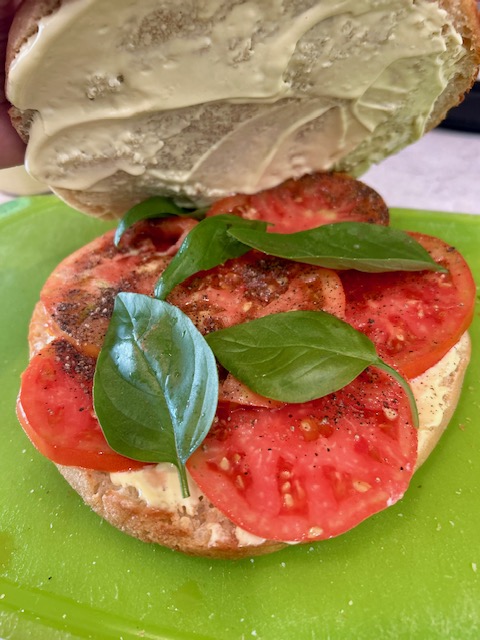 While the focaccia is crisping up, make the mayo and slice the tomatoes