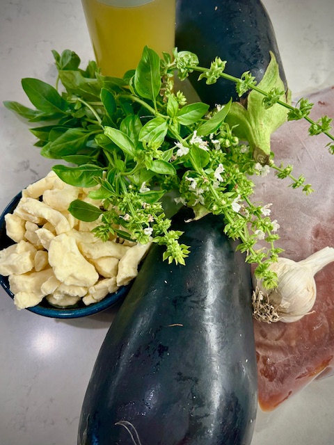 First, thaw pesto and tomato sauce either overnight in the fridge or by immersing in cold water while you do your other prep.