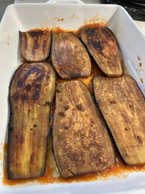Pre-heat your oven to “broil”. Once the eggplant has soaked, place it on a parchment lined sheet pan and broil it until nicely golden/caramelized. This can take anywhere from 10-20 minutes total so keep a close eye on them and flip the slices when they look done.