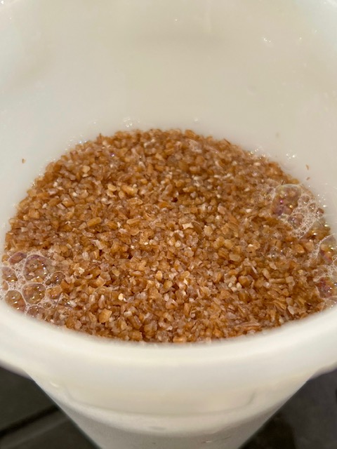 Start by soaking the bulgur in some hot tap water. Add enough water to cover it by about one inch. You can use a sprouting jar or just soak it in a bowl. Set this aside to start to expand while you prep the tomatoes. The goal is to partially hydrate the grains and then let them finish hydrating with the juice from the tomatoes.