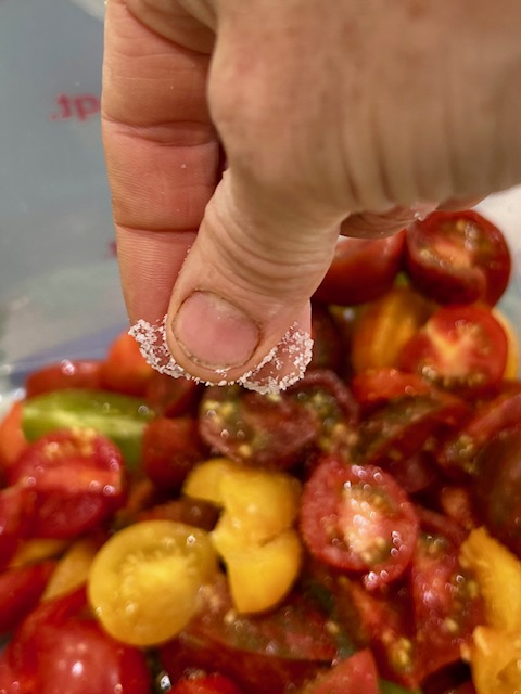 Next, wash and cut the cherry tomatoes. A quick and easy way to cut them is to place them between two deli container lids and cut crosswise while holding the top lid down firmly. If you would like them quartered, you can then rotate their orientation and repeat the process. Place the cut tomatoes in the salad bowl and sprinkle with a little salt to help to release the juices.