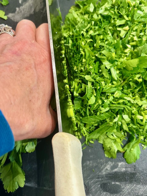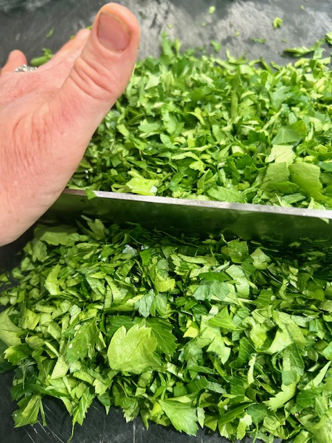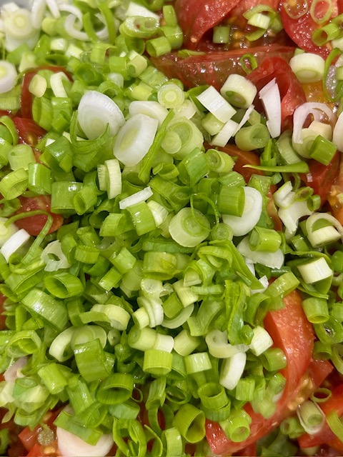 Next, finely chop the green onion and herbs. In my photos, I am using some green onion from our fridge. The enormous onion in your box this week will need a bit more chopping! Put this in next so that the tomato juice will start to mellow the sharp onion flavour.