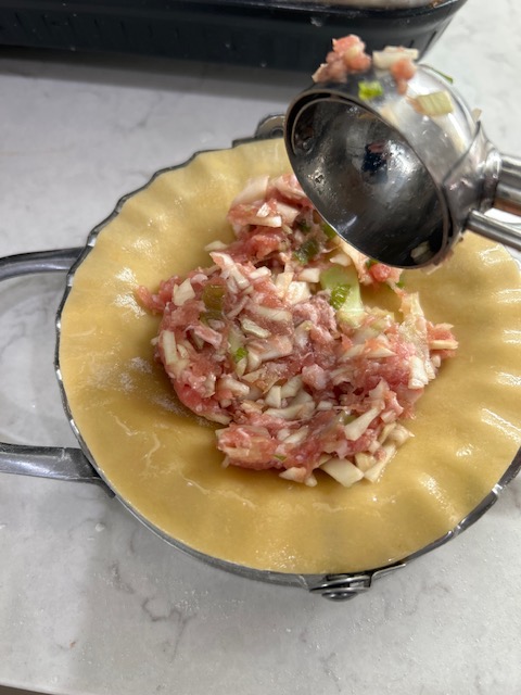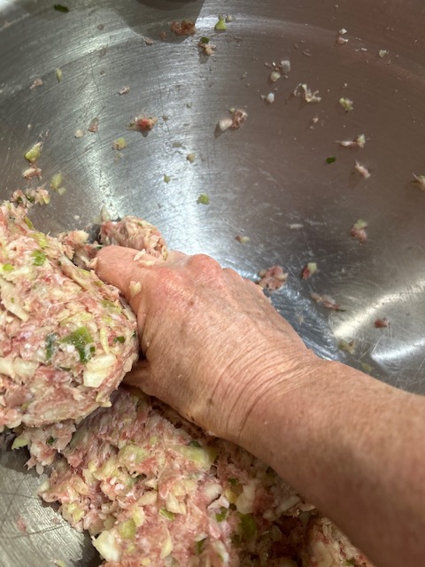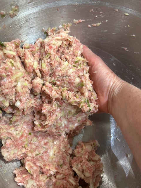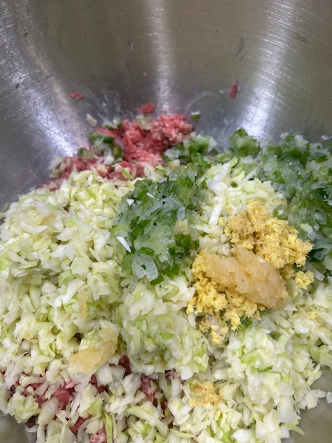 Then mix together pork, cabbage, ginger, garlic, 1 tsp each of salt and pepper, 2 tsp of sugar and a tablespoon of soy sauce.