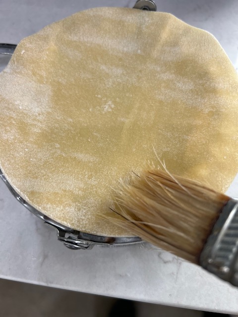 If you are using frozen home made pasta for your dumpling wrappers, leave it in a sink of cold water to thaw while you start to prep your veggies. Once the pasta is thawed, roll to the thinnest setting of your roller and cut to the size of your dumpling folder.