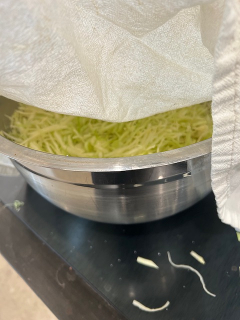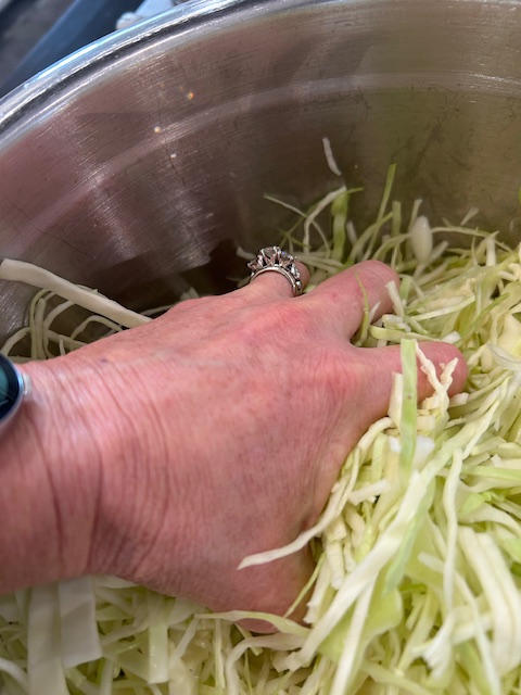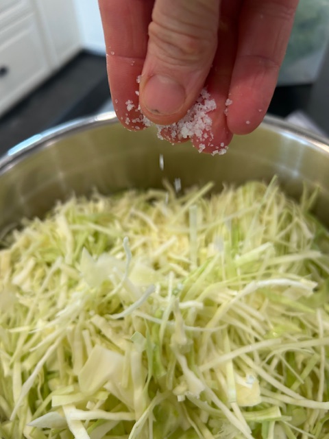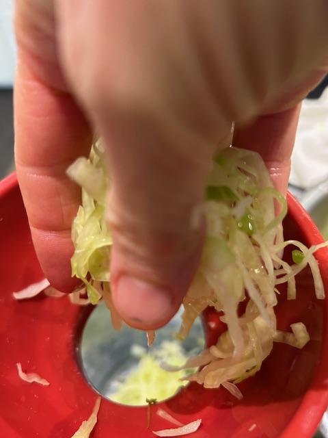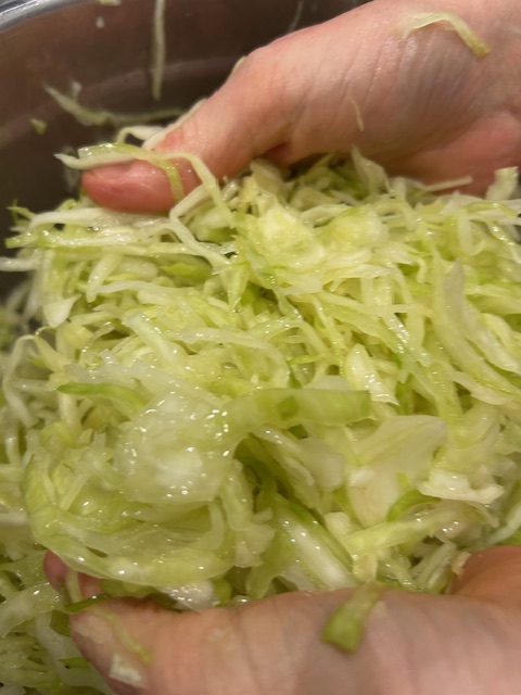Start by adding about half of the salt you have weighed. Massage it into the shredded cabbage. Taste a bit of the cabbage. It should taste lightly salted and delicious. If there is not enough salt, go ahead and add more until it tastes just right. Then continue to massage the cabbage until it is starting to release it juices.