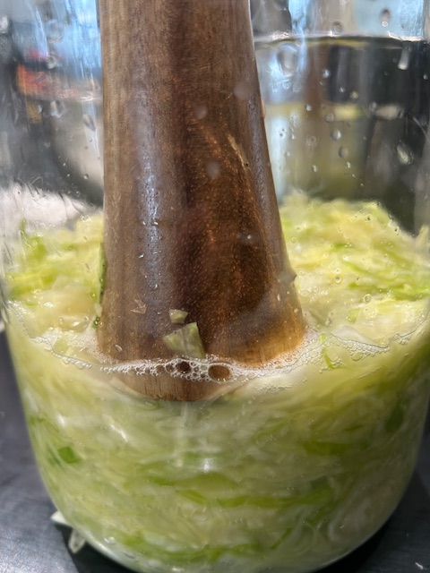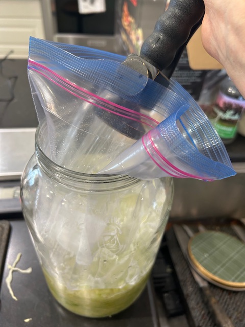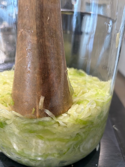 Whatever vessel you are using, add the cabbage a bit at a time and pack it down with your hands or a tool (a blender stick or a potato masher work well) as you go to make sure there are no air pockets. There should be at least a thin film of brine on top of the cabbage leaves. Fill the jar about half way.