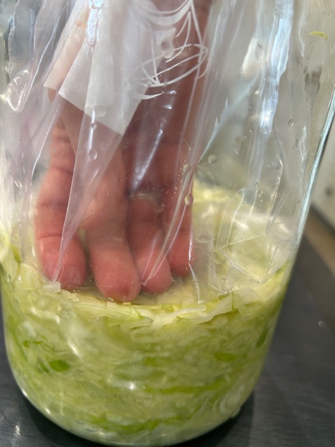 Give it another little massage to make sure it is releasing brine. Then start to pack it in a large non-reactive container. You can use a fermenting crock, a large glass pickle jar or a collection of smaller jars if that is what you have available.