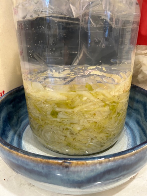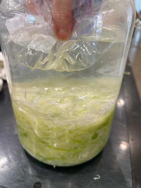 Next, you will want to cover the leaves to make sure they all stay under the brine and then top this with a weight. You can use a cabbage leaf to cover the leaves and then a special fermentation weight to hold it down or you can accomplish this all at once by covering the leaves with a zip lock bag, filling it with enough water to keep everything submerged and then zipping it tightly.
