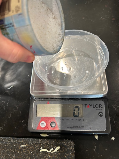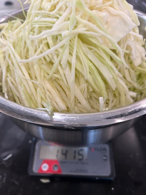 Weigh the sliced cabbage. Then weigh 1.5% of the cabbage weight in salt. It is best to use a natural and unrefined salt (most micronutrients and no added ingredients that could negatively impact the fermentation).