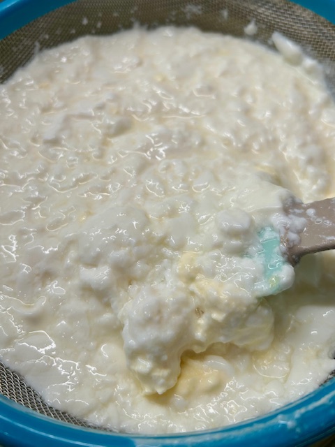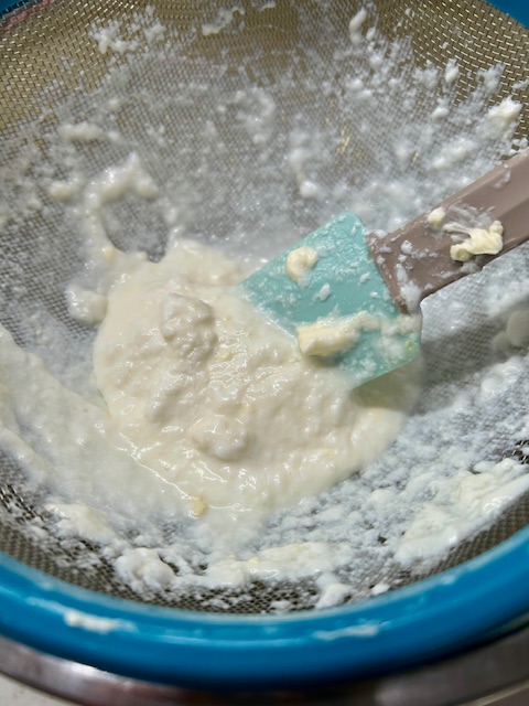 Pour the fermented kefir through a fine mesh sieve. You will notice rubbery “grains” that look like cauliflower or cottage cheese. The goal is to push the kefir through the sieve while protecting these grains from being damaged. You can do this by carefully stirring upward from the bottom of the liquid to push the kefir though while protecting the grains from contact with the sieve.