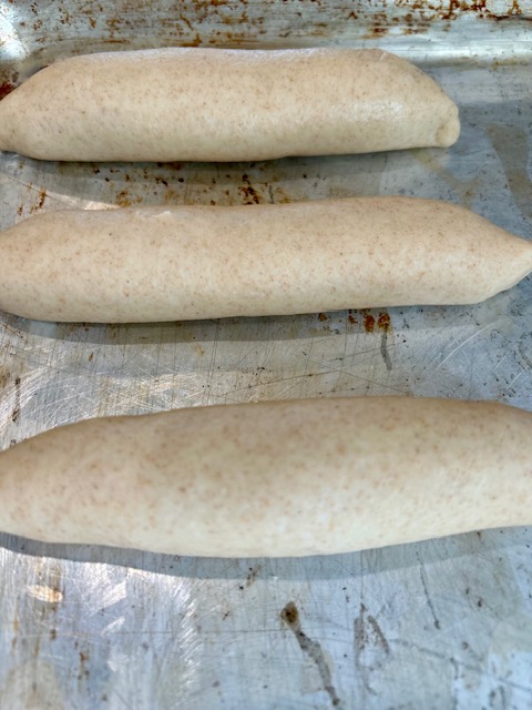 Place each bun, seam side down, on the buttered sheet pan, each about 1 1/2″ from center to center.