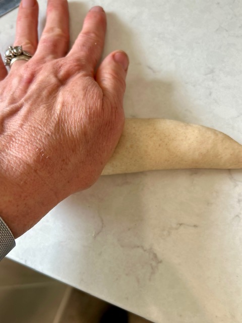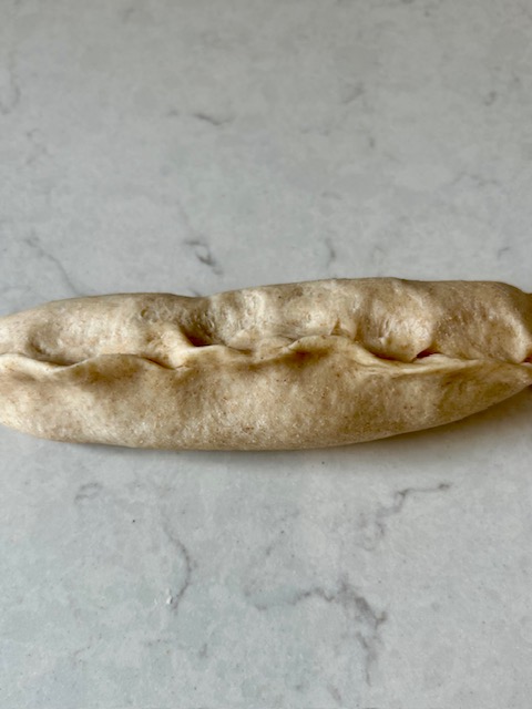 To shape, roll each tiny ball flat with the heel of your hand or a rolling pin then flip it upside down, pull out the bottom corners and fold down from the narrow end to the wide end ~3x until meeting the bottom edge. Pinch where the bottom edge joins the rest of the dough to form a seam then roll back and forth between your hands and the counter to seal and elongate to 6″ .
