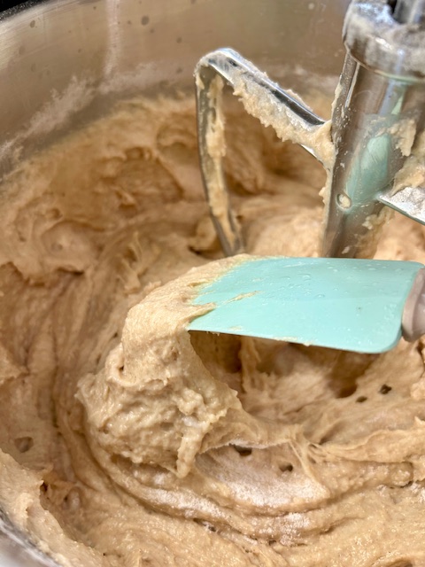 Once the slurry has cooled to 105-115 degrees and the milk mixture has heated to the same temperature, add these to the flour in the mixer. Slowly mix until combined and then beat at medium speed for about 2 minutes until the mixture is smooth.