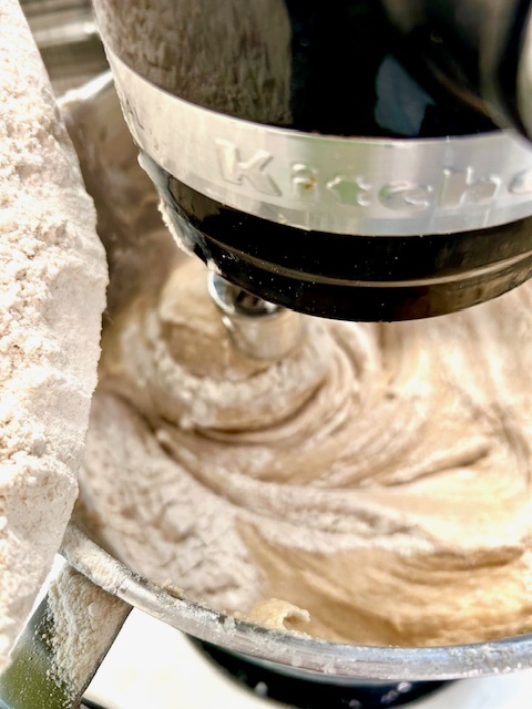 At this point, change to the dough hook and gradually add remaining flour then mix at low speed until the dough is pulling away from the sides of the bowl and is elastic. If the dough is not pulling away after 5-8 minutes, add a bit more flour, a few tablespoons at a time until it starts to form a ball.