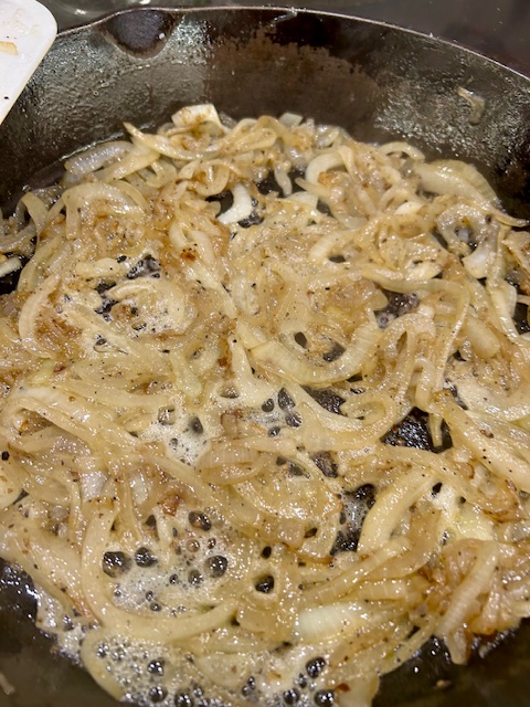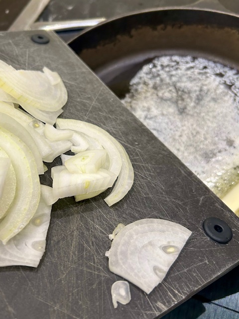 Finely slice one onion while heating butter in a skillet over medium-high heat