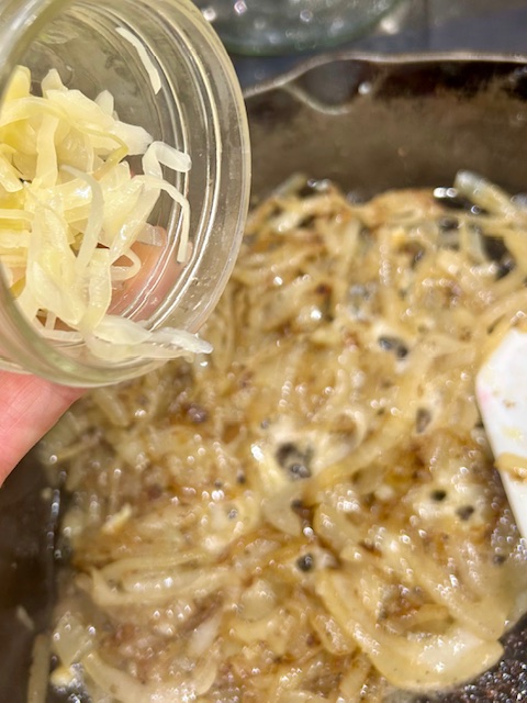 Add onion to foaming butter, add salt and pepper and saute until lightly golden. Add 1/2 jar sauerkraut, continue to cook until heated through and well mixed then serve.