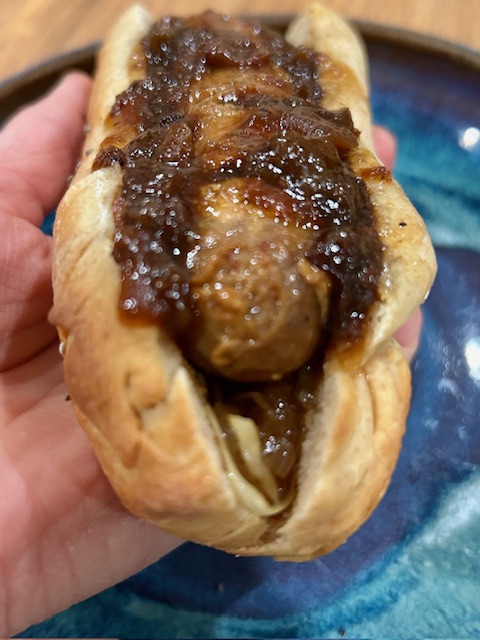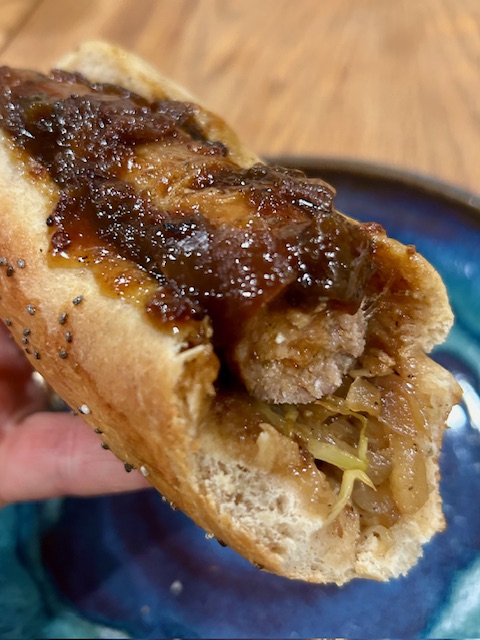 With the bulk of the cooking done in advance, winter is a great opportunity to make simple fare special with next-level breads and toppings. Serving our pasture raised pork sausages on home made buns with home made chutney, fried onions and sauerkraut is a perfect example.